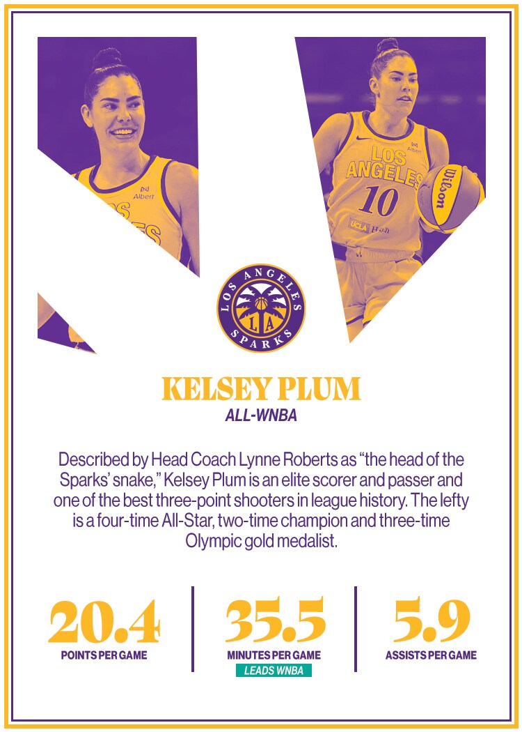 A four-time All-Star, including this season, and two-time WNBA champion, Kelsey Plum leads the W by a landslide in games of 20+ PTS and 5+ AST with 18 (next-most has just 12). She also ranks second in FTM, fourth in PPG and 3PM, sixth in APG and seventh in FT%, earning 2025 All-WNBA selection.